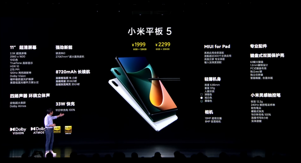 Seooo Oirunhkm from wx2.sinaimg.cn 新浪财经app 缩小字体 放大字体 收藏 微博 微信 分享 4. 此次,小米平板5系列共有两个版本,其中小米平板5 6+128gb版本售价1999元,6+256gb版本售价2299元,拥有深锖色、炫白色和墨绿色三种选择。 小米平板5 (6gb/128gb/wifi) 高通骁龙860,11英寸lcd显示屏,120hz刷新率,1300万像素后置 之前有消息称小米平板5有两款不同的型号,不过根据最新爆料显示小米平板5有三款不同的型号,分别为小米平板5,小米平板5 pro以及小米平板5 pro+,搭载高通处理器,分别为骁龙 870、骁龙 860 和骁龙 7 系处理器,搭载类似于小米mix fold的miui系统,支持pc模式等功能,根据爆料显示小米平板5标准版的价格会在3000元以内,这也会是小米平板5的一大亮点。 小米平板5 平板电脑 pad 官方 标配. 此外,与ipad相比,android平板有一个非常大的优势,那就是价格便宜。目前在售的matepad pro、galaxy tab s7+等旗舰产品,配置都不输于ipad pro,价格却便宜不少。小米在业内素以性价比闻名,相信小米平板电脑5的价格也会非常实惠,足以令广大米粉心动。